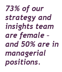 Simply-put, asking ourselves would the recommendations really resonate with who we’re trying to reach, is crucial. That’s why in the strategy and Insights team at Four, 27% of our staff is ethnically diverse and 73% of our team are women.